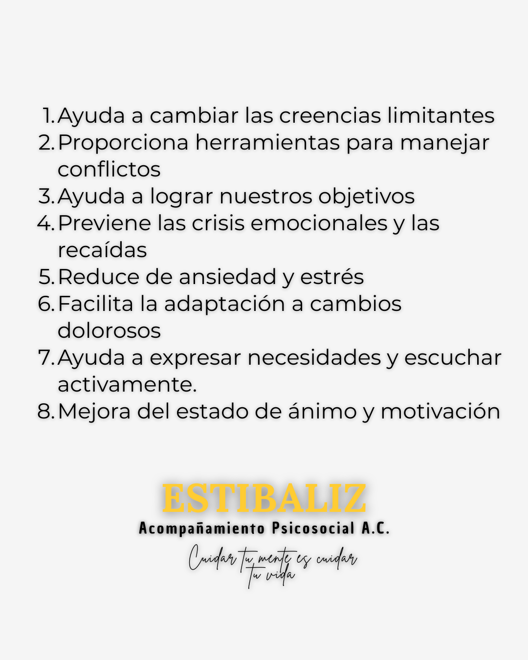 En la atención psicológica se proporcionan herramientas y apoyo para mejorar el bienestar emocional, el autoconocimiento, resolver conflictos, transformar creencias limitantes, manejar el estrés, las emociones, y fortalecer las relaciones personales, contribuyendo al crecimiento personal y a una mejor calidad de vida.